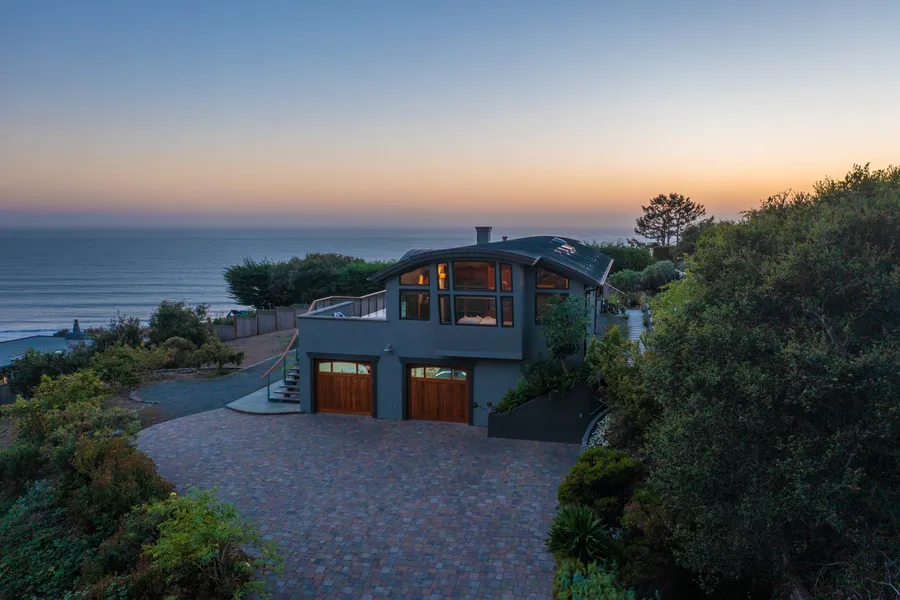 Set back from the street, this home is expansive and private. Two levels of living, decking and patios face due South, allowing for year round entertaining and maximum sun exposure. The open floor plan is defined by an arched ceiling with exposed beams and oversized windows offering spectacular views. The great room seamlessly flows out to a spacious outdoor wrap around deck that has sweeping views from the ridge of Mount Tam out to the expansive Pacific Ocean and across to Duxbury Reef. The primary bedroom enjoys both mountain and ocean vie...