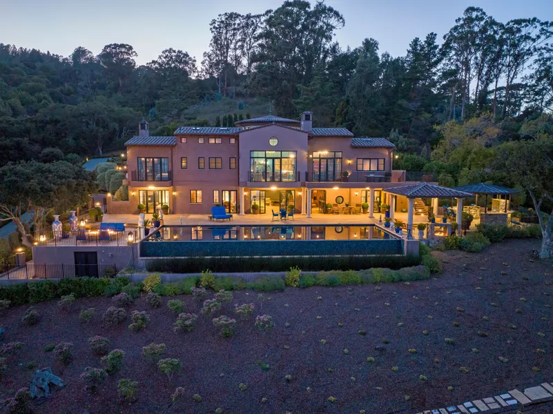 Ideal for the entertainer extraordinaire or a family, the home features large living and entertaining spaces with high ceilings, limestone floors, and high-end finishes throughout. Indoor/outdoor living is elevated to the highest level, with expansive outdoor terraces framing a large infinity edge pool, an adjacent outdoor kitchen, and a sleek fire pit lounge area. Additional highlights include a top-of-the-line chef’s kitchen, gym with shower, established orchard, four fireplaces, security system, and a luxurious primary suite on the main level. Just minutes from downtown Tiburon and nearby San Francisco, this waterfront estate offers supreme privacy and resort living in one of the most desired areas in California.