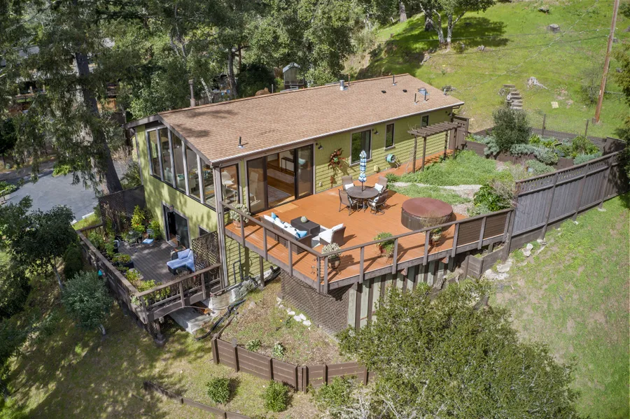 A San Geronimo Valley gem where a custom house and three other structures create an appealing country compound. Set on 2.3+ sundrenched acres at the far end of a quiet road, a major vista unfolds across soaring living room windows and an open-air deck. With an eye on indoor/outdoor living around the house as well as between buildings, this inspired property includes a two bedroom, two bathroom home with private, lower-floor guest quarters, day-use yurt for office or workshop, greenhouse for year-round growing and a solid shed for tools and dry storage. Plus, a protected stone patio houses a large pizza oven, barbecue, and picnic table. Additionally, a stand-alone roof shelters a road-worthy Airstream for offsite camping. The house embraces daytime solar warmth, nighttime twinkling stars, and is surrounded by abundant flora and fauna. It’s replete with artistic custom details designed and installed by the owners. Located at the foot of Mount Barnabe, it's a convenient drive east to urban Marin, and west to rural West Marin and the coast.