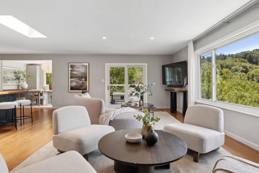 This spacious four-bedroom plus office, three-full and two-half-bath home is a sun-soaked retreat, perfectly positioned to take in golden light from sunrise to sunset. Ideal for those who love having close proximity to downtown Fairfax with an active lifestyle, the home is moments from lakes, hiking, and biking trails within Mount Tamalpais State Park.