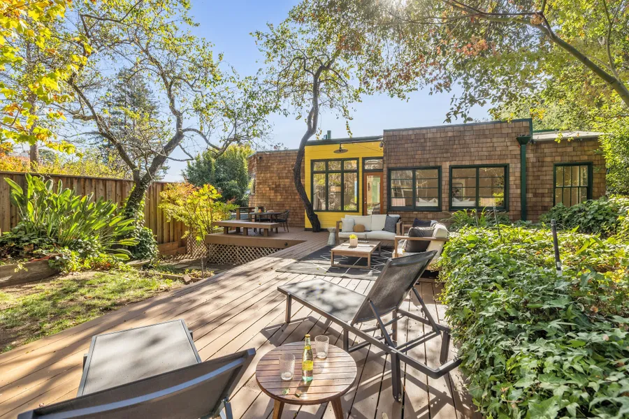 Outdoor living shines with a 636 square foot deck just off the main living spaces, offering an ideal setting for lounging, dining and taking in the hillside. The backyard itself is a private garden oasis, featuring a striking steel-and-glass greenhouse set on stonework, a charming treehouse and a vintage tool shed, all surrounded by lush, vibrant landscaping.