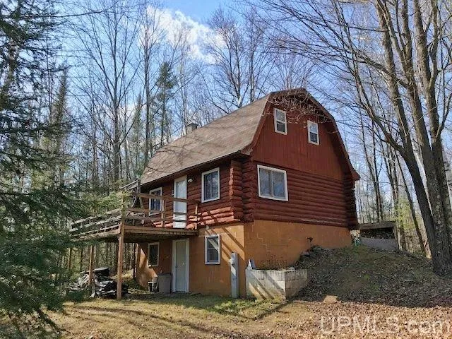 Authentic 3 BR, 1.5 BA log cabin on 9+ wooded acres. A perfect Northwoods setting! Features an open concept KT/LR area with woodstove, upper level has 3 BRs with 1/2 bath, lower level has den with 3/4 bath. Sold completely furnished; everything you need to start vacationing. Nature and privacy are what you'll find on this 9.64 acres with a nice mixture mature trees, rolling hills and valleys; a prime habitat for whitetails, rabbits, grouse, etc..Nestled at the end of a quiet dead end road for seclusion, has ATV route access, and not far from town. Don't miss out..this property wont last long on the market!