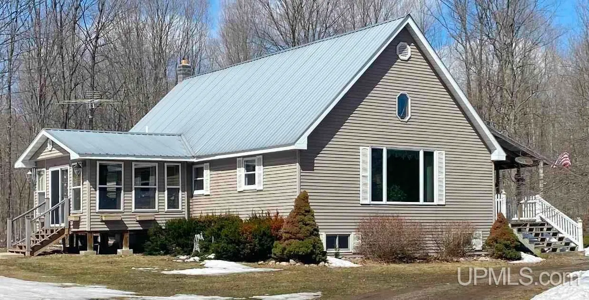 Year round home located on 32 wooded acres in northern Marinette County. Galley kitchen along w/ 2 bedrooms on the main and large upper loft bedroom. Open concept living/dining area with knotty pine paneling. Full basement with lots of storage & East part has 20"x40" windows & is partially finished. 24x28 detached garage, chicken coop & 2 wood storage areas. 12x14 3 season room. Woods are mainly hardwoods with sugar maples. Outdoor wood furnace