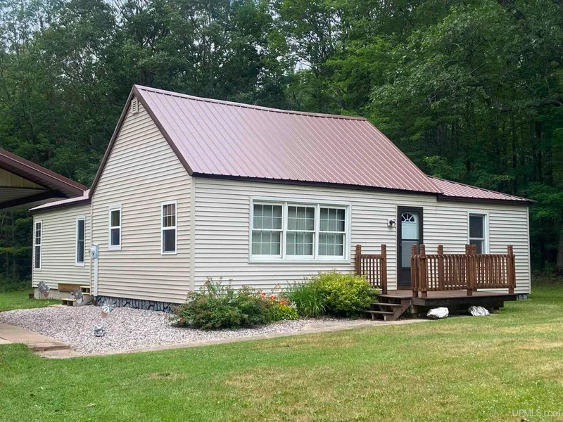 Are you looking for a full-time home, or a cabin in the woods? Then this just maybe the place you are looking for. The Living room is surrounded by windows which not only allows natural daylight in, but you have the best views to watch the wildlife. Kitchen has new cabinets, and the countertop is on order and will be installed soon. Bathroom with shower stall and storage. Dining area and first floor bedroom. In addition to the loft area there is another area in the home that you may choose as additional sleeping area. Maintenace free vinyl siding, front porch area and a 2-car detached garage. This all sits on 2.5 acres of land. Did I mention there is a basement and laundry hookups? What more do you need? All remaining furniture and appliances are even included.