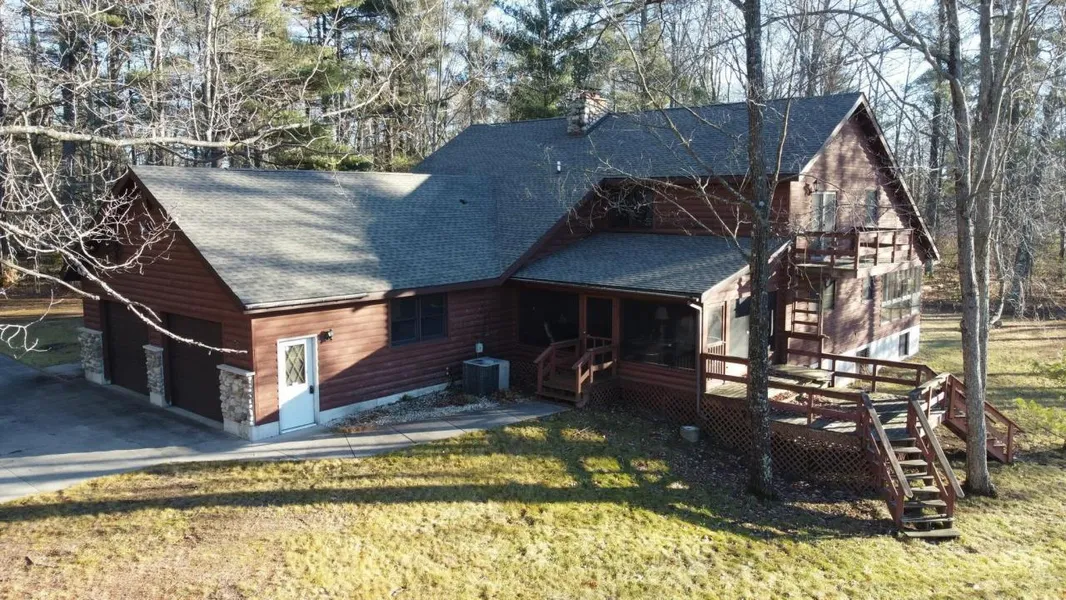 If you enjoy the great northern outdoors where you can hike, hunt deer, bear and grouse, have your own waterfowl area, fish for panfish and enjoy kayaking or a pontoon ride on the privacy of your own lake, set on 30 acres, then this is it. This log and stone sided 1.5 story home features a massive floor to ceiling stone fireplace in the living room. The master bedroom has it's own fireplace with a deck that overlooks the lake. The family room has all south and west facing lake view windows. Relax on the screen porch. The lower level is unfinished but has daylight windows along the south and west walls where there is plenty of space to add a rec room, bedroom or a shop. 30x50 pole building for storage. Adjacent 47 acres west of the lake is also available for sale