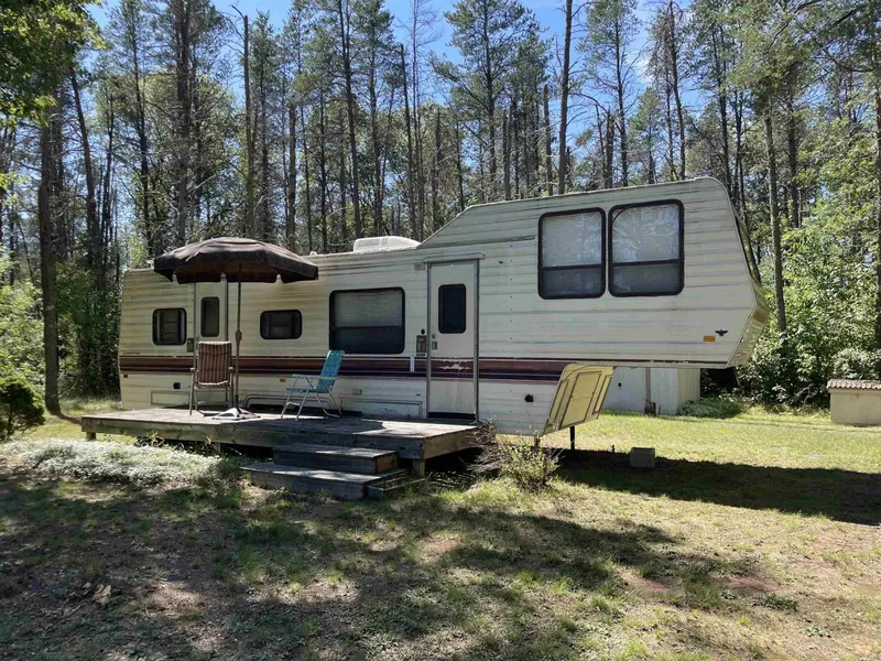 Private wooded park-like setting is all set for your weekend retreat. Older 5th wheel camper is set up with water (sandpoint well), septic and electric, or bring in your new camper or all set to build your new cottage or home. Easement access. Direct ATV/Snowmobile access.