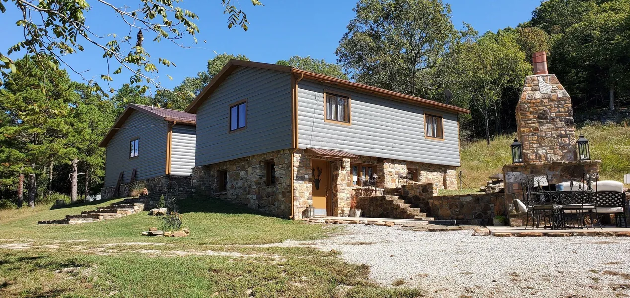 What a display of craftsmanship, elegant design, southern comfort, and natural beauty. This cabin is set amongst the rolling hills of the wooded Ozarks and paints a picture that Kincade himself wouldn't attempt to match. As you enter, wander off the gravel county road onto the well-maintained and recently chatted drive and you immediately sense the presence of wildlife. The thick cover and natural brows are evenly spread throughout the property and provide excellent habitat for the dense populations of whitetail deer, turkey, black bear, and all sorts of small game. Numerous strategically placed tripod stands, ladder stands, and box stands are placed throughout. The topography of this tract helps set it apart, not too steep but just enough terrain to give ample hunting setups from large oak flats and saddles to recently cleared areas for food plots and several water sources including a pond and a small year-round spring. There are several stands of mature and gorgeous white oak, post oak, red oak, and hickory that provide fall food and excellent hunting options for the bowhunter. Powerlines have been capitalized as good hunting spots with great vision and ambush areas for the gun hunter. Meandering through the heart of the property, the driveway cuts through the main valley making the drive breathtaking. Recent trails get you all over the land and add to the endless recreational fun this place offers, from ATV rides to hikes and picnics to the hunt of a lifetime; it's all accessible. Rounding the final bend of the gorgeous drive, the star of the show is revealed. This awe-inspiring cabin and shop are like nothing you've seen. The setting is the definition of quiet, remote, private, and tranquil as it is situated in the valley surrounded by massive rock out-croppings, wonderful hardwood timber, and mountains all around. This custom 3 bedroom and 3 bathroom masterpiece is loaded with character and custom features you have to see to believe. Intricate rock work and masonry are on full display all around the cabin and shop. The outdoor entertaining area is a sight to behold with a massive fireplace, seating area, rock rails, and even a covered prep area off the shop. A new metal roof painted cedar exterior, and a well-manicured lawn all add to the nostalgia of this gem. Entering the cabin takes you back in time but also brings you home with modern upgrades and rustic design. The timber frame is built to stand the test of time with massive timbers, hardwood floors, and rock floors. The kitchen is fully customizable with quartz countertops, stainless steel appliances, and much more! A wet bar, open den, and full bath top off the ground level. The main level features two massive guest bedrooms with another fully customized beautiful bathroom. The foyer leads to the immaculate master suite featuring a large dual vanity, marble shower, oversized walk-in closet, seating area, private toilet room, laundry room, and some of the most stunning design and detailed woodwork one could want. Next to this amazing structure is the large shop with a bay door, newer windows, fully insulated and finished on the inside; providing more than adequate storage for your tractor, UTV, and any equipment needed to maintain this world-class property. Even more... you are just minutes to the Buffalo National River, Bull Shoals Lake, Crooked Creek, the White River, and more. All right at your fingertips, this is truly your home away from home. Finding a place like this is a rare chance, don't miss it. Call today for your private showing!