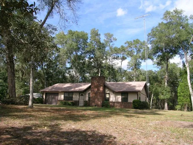 NEAT HOUSE ON CORNER LOT IN QUIET NE COMMUNITY. Split floor plan with vaulted Cypress beam Living Room with Brick Fireplace. Large Florida Room with lots of windows. Attached One-Car Garage. Pole Barn with fenced pen for animals. Landscaped and several beautiful Oaks.