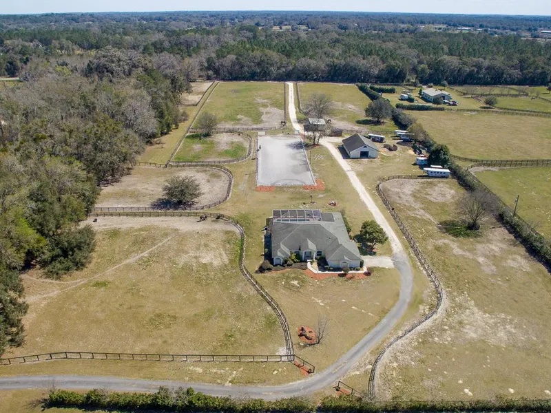 Located 4 miles from HITS and from I-75 in the heart of Ocala's NW horse country is an income producing farm with professionally built Olympic size, irrigated, lighted and mirrored dressage arena with excellent footing, 6 paddocks well-suited for a jump field and an additional 10 acres available for a cross country course. Convenient to town and close to all equine amenities, this 10 acre property features a spacious 3000 sq. ft. +/- 4/3/1 pool home with gorgeous wood floors and elevated ceilings, generous countertop space, gas cooktop and eat-up bar in the kitchen, living room with fireplace, family and formal dining room and office. The home also offers a huge master suite and a guest room perfect for an in-law suite. Set back off the road for privacy, this working farm is complete with a separate barn entrance, a coordinating concrete block, 7 stall center isle barn with tack and wash stall and a 3 stall frame barn with hay storage to satisfy all of your horse needs.