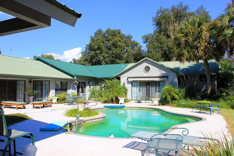 Stonewall Farm is one of the most picturesque farms available in Ocala. Located on scenic road, this farm is located next to the famous Live Oak Stud, Double Diamond Farm, & Kinsman Stable. From the moment you pass through its landscaped gated entrance you will realize this farm has it all. The main home is 4,000+ sq. ft. and has 3 bedrooms with a lavish master suite, huge living room, pool, cabana, & a koi pond with a waterfall. The second residence features 2 state of the art guest suites that are like new. There is also a large 3/2 managers home. The whole farm and its residences are immaculately landscaped. The stallion barn has 8 huge stalls, a large breeding shed, ample paddocks, & it is only a short walk from the owners residence. Other improvements include: 16 stall mare barn with huge office, tack room, feed room, & bathroom. All surrounded by incredible hilltop shaded paddocks. Also features a 16 stall yearling barn, a euro walker, utility barn with 4 stalls, & an equipment shed.