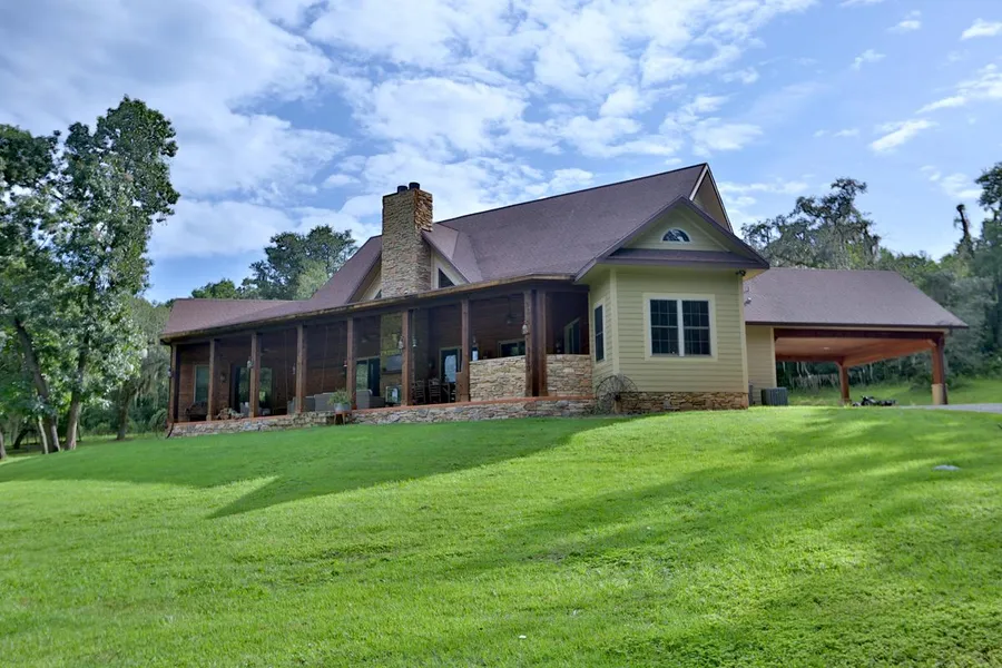 Private, Secluded and Architecturally designed custom home on 207+/- pastoral acres with majestic wilderness, nature views, trail riding, and fishing. As you drive up the property you are drawn to the front porch with the rocking chairs greeting you to come site and visit. The double entrance door leads to an expansive foyer welcoming you to enter the home. Highlighted with intricate woodwork from floor to ceilings. Spacious living room with floor to ceiling stacked stone gas fireplace, cathedral ceiling, and large windows, dual sliding doors on which provides magnificent outdoor views. Adjoining the living area is a deluxe chefs kitchen with raised bar seating area, center island with prep sink and 2 refrigerated pull out drawers, granite countertops, stainless steel refrigerator, built in oven, microwave, and gas cooktop with vent hood. Formal dining room with large windows overlooking the views and sliding glass doors leading to back porch. Owners suite with high ceilings and double doors leading to porch en-suite bath with dual sinks, tub, and walk in shower. Additional 2 bedrooms and 2.5 baths plus den. Expansive laundry room with build in shelving and shoe storage. Enjoy the upstairs entertaining area or the evening sunsets sitting on the lanai. Features include wood floors, tongue & grove ceilings, and beams throughout. This home was built with family and entertaining in mind. Expansive covered patio features an outdoor kitchen, sitting area, porch swing and stacked stone fireplace all overlooking the beautiful views of the property. The porch is accessible from any of the 3 double sliding doors. For the equestrian lover there is a 5-stall barn with insulation in the ceiling plus attached covered open parking area for horse trailer or equipment. Cute 1 bedroom/ 1 bath apartment located over the barn. Office/breakroom with sink, refrigerator, and bath with shower. Enclosed workshop area. This home is truly a natures lover dream Property offers a true feeling of seclusion, and it adjoins the Chernobyl Memorial Forest which is 314+/- acres of forest which was dedicated to honor the victims and survivors of the 1986 Chernobyl disaster. There is 4.6 miles of trails around the forest with beautiful wild wildflowers. You also have access to Ocklawaha Prairie Area and National Forest for hours of riding, hiking, biking, running and paddling.