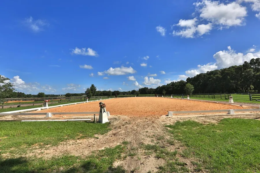 14 +/- Acre equestrian farm conveniently located between Ocala and the Villages plus just minutes to the Florida Horse Park. As you drive up the tree lined drive you will notice the lit polo field and lush green paddocks. You arrive at the center aisle barn 10-stall barn with tack room, feed room, and hay storage area. There are seven feed stalls under the shed row. The covered shed rows are large enough to park your horse trailer and equipment. Your guests or employees will enjoy the two 1 bedroom/ 1 bath apartments. As you continue on you will notice the 80 x 225 riding arena plus the additional paddocks for a total of 9 various sized paddocks graced with granddaddy oaks and lush green grass on the farm. Property is fenced with 4 board fencing. No deed restrictions so you are allowed to have horses, cattle, or chickens. This property is perfect for any discipline of horses. Exquisite l...