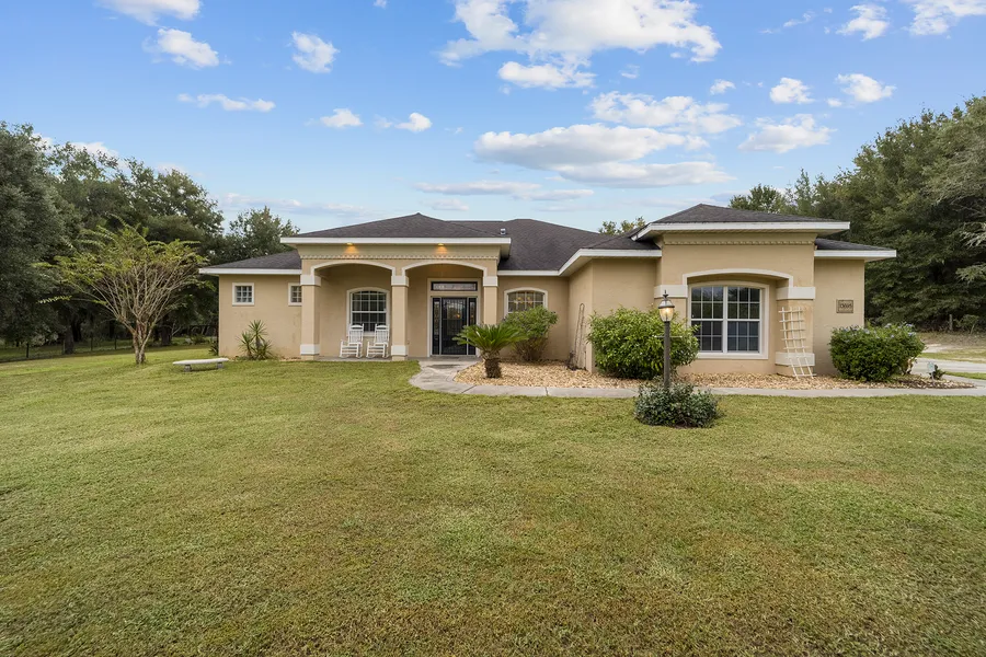 Home on 8 acres! Have your farm here! Exceptional living with a custom home offering a multiple of amenities. All of this is just minutes from entertaining, shopping, supermarkets, stores and more. Bring for your livestock or just enjoy the peace and quiet while minutes from The Villages. Welcoming you through to the grand entrance foyer area, exuding pride of ownership into a family. Congregate in the formal dining room, perfect for holidays and entertaining. Let's feature the split bedroom plan to include three bedrooms and three baths filled with spacious exquisiteness. This home offers a private office/den as well. The living room consists of built-in features, 10-foot ceilings throughout, solid doors, crown molding, wood or tile flooring, tray ceilings and trim work. A chef's well-equipped kitchen, offering enjoyment to any culinary experience, lots of cabinet storage, granite countertops, detailing a wraparound breakfast bar, center island, as well as additional seating in the breakfast nook. The master suite is especially notable, with plenty of space for additional seating and an en-suite that boasts a luxurious bath with jetted tub, dual sinks and shower. Coffered and tray ceilings, custom lighting add to the ambiance. Home comes with two outdoor sheds. It's hard to list all the indoor and outdoor features of this stunning home. Schedule a tour today. Video Available for Walk through- ADDITIONAL HOME FOR SALE AJOINING ON 1.2 ACRES 2/2 SEPARATE FROM THIS PURCHASE INQUIRE FOR ADDITIONAL INFO. CAN BE SEPARATE MOTHER IN LAW HOME