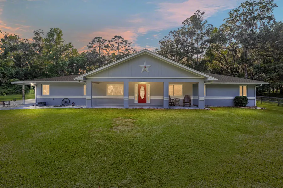 Bring your horse! Explore this expansive ranch-style home, beautifully on a generous 1.58-acre lot that combines the tranquility of a park-like setting off Interstate 475, with conveniences of proximity to town. Just 10 minutes away, you'll find all the downtown Ocala scene with shopping, dining, and medical facilities and hospital. The home boasts a family room with soaring vaulted ceilings and a separate formal dining room, complemented by additional space ideal for a den or office. Revel in the chef's kitchen, which features an open floor plan and is equipped with new appliances from 2023. Ample cabinet and counter space, and an oversized kitchen sink make it an ideal venue to unleash your culinary creativity. This four-bedroom, two-bath split floor plan residence offers numerous updates and upgrades, including a newly fenced area suitable for horses and two paddocks/pens to include water hookups, roof in 2022, 2024 interior/exterior paint throughout, hurricane-resistant windows, 2017 air conditioner, 2024 water heater and 2024 new well accessories with a whole-house Pelican filtration system. Don't overlook the allure of the screened-in porch and patios, ideal for outdoor relaxation and entertainment. Additionally, two electrified outbuildings provide ample storage for lawn equipment or recreational vehicles like ATVs and other outdoor toys. This home is an ideal blend of rural charm and modern convenience for those looking for space and serenity near the amenities of the city.