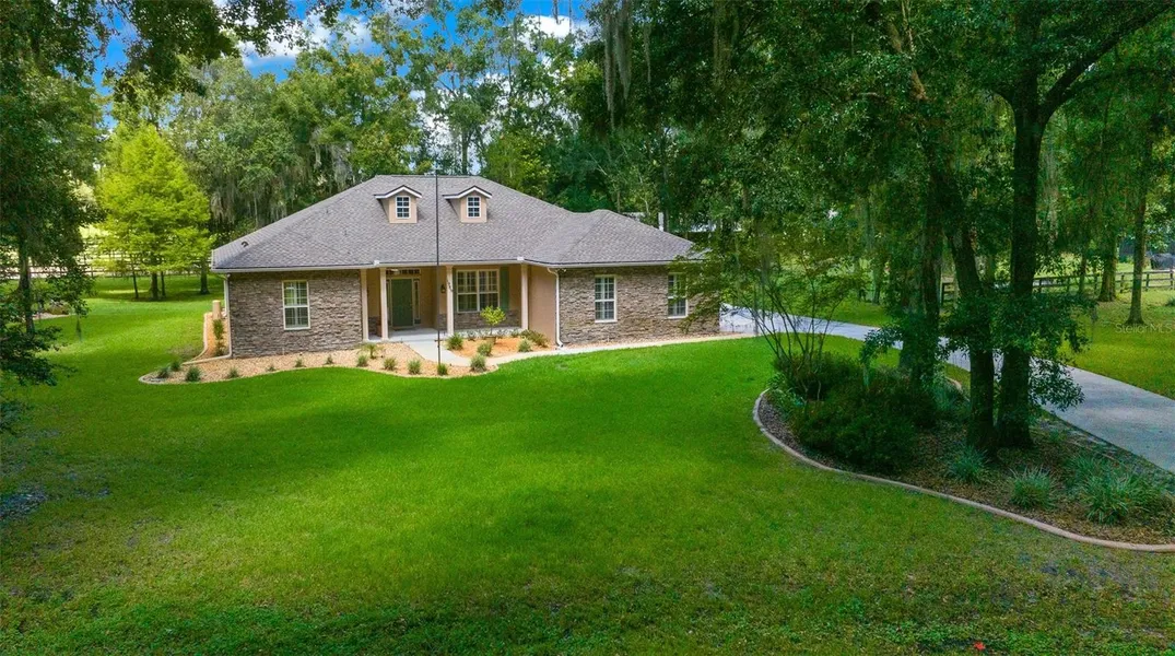 Under contract-accepting backup offers. CALLING ALL buyers in search of a PEACEFUL and BEAUTIFUL piece of Ocala's Equestrian lifestyle! VERY SPECIAL, custom home in Summit Downs, a gated community tucked inside the mini farm community of Ocala Downs, which is also gated! What peace of mind you can have feeling so secure! Sitting on a gorgeous 1.24 acre lot, this very sharp looking home has 3 bedrooms, 2 bathrooms, 2342 living sq ft and a large open screened patio overlooking the neighboring horse farm. MANY UPGRADES: Amazing custom kitchen with granite tops, wood Cabinetry with new Amerock hardware and soft close hinges,under counter LED lighting, custom stone backsplash, wine refrigerator, new sink and new gun metal fingerprint-less stainless steel appliances. The stone gas fireplace was enhanced and sealed. All interior and exterior doors received new hinges, handles and locks. Custom Plantation Shutters were installed and shelving was upgraded in laundry room and both master bedroom closets. In both bathrooms are granite tops, new sinks, new faucets, rebuilt toilet tanks and soft close lids. Master bath has custom made vanity. Laundry room has new laundry tub, new faucet and granite tops. All new smoke detectors, ceiling fans, switches, receptacles and plates. The patio has a 220V to add a hot tub. All new interior and exterior lighting(converted to LED) and paint. New septic lateral field in 2022 along with a septic pump out, new 30 Yr GAF brand shingle roof installed Oct 2023 with transferable warranty, brand new water heater, new 7 zone sprinkler system and Florida friendly landscaping using river rock was installed. The home has a central vacuum system, side load garage, beautiful stone accents on the front and has an inviting farmhouse feel. You MUST come see this home, fall in love and make it yours!