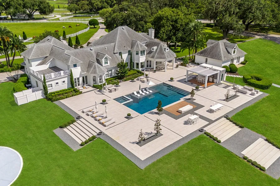 Under contract-accepting backup offers. Welcome to the crown jewel of Ocala, a luxurious 87-acre equine estate that borders the pristine Florida Greenways and Trail. This expansive property offers an unparalleled blend of modern luxury and equestrian elegance, designed for those who appreciate the finest in life. The main estate, spanning approximately 10,000 square feet over two stories, features eight spacious bedrooms, including a separate caretaker's quarters, ensuring comfort and privacy for all residents. The home received a new roof and exterior paint in 2020, adding to its well-maintained allure. As you step into the grand foyer, you are greeted by dramatic 20-foot ceilings and an elegant winding staircase, one of three wood staircases with hardwood treads that add warmth and character throughout the home. The estate is built for both relaxation and entertainment. The gourmet gathering kitchen is perfect for hosting, and the oversized dining room can accommodate large gatherings with ease. The entertainment area is designed for leisurely enjoyment, making it an ideal space for spending time with family and friends. Adjacent to the main residence is a 1,200-square-foot Game House, providing additional space for recreation and entertainment. A lighted pickleball court, train station with animated track, carousel, and basketball court are a few of the highlights of the estate. Additionally, five fully furnished cottages are thoughtfully designed to match the estate's luxury, offering guests their own private retreat. The property's resort-style amenities are equally impressive. On the west side of the residence, you'll find a newly constructed rectangular in-ground pool with a jacuzzi, submerged lounge areas, swim-outs, and LED lighting—perfect for relaxing and enjoying sunsets. A cabana, complete with a summer kitchen and full bath, adds convenience and luxury to the outdoor living space. For the equestrian enthusiast, this estate is a dream come true. The property features a 30,000-square-foot covered riding arena, constructed of steel with canvas curtains between supports. The arena's floor system includes a clay base with a sand overlay, offering an ideal surface for training and riding. Additionally, the estate includes a ranch office, a manager's home, and three barns with ample stalls. The grounds also feature 15 paddocks, a polo field, and a helicopter pad, making it a true equine resort. The property is surrounded by miles of emerald, green pastures and large oak trees, showcasing the natural beauty that Marion County is renowned for in the horse capital of the world. Masterfully designed by Taylor Hannah Architect, this estate is the epitome of modern luxury meeting equestrian elegance. Whether you're seeking a peaceful retreat or a place to entertain on a grand scale, this property offers it all.