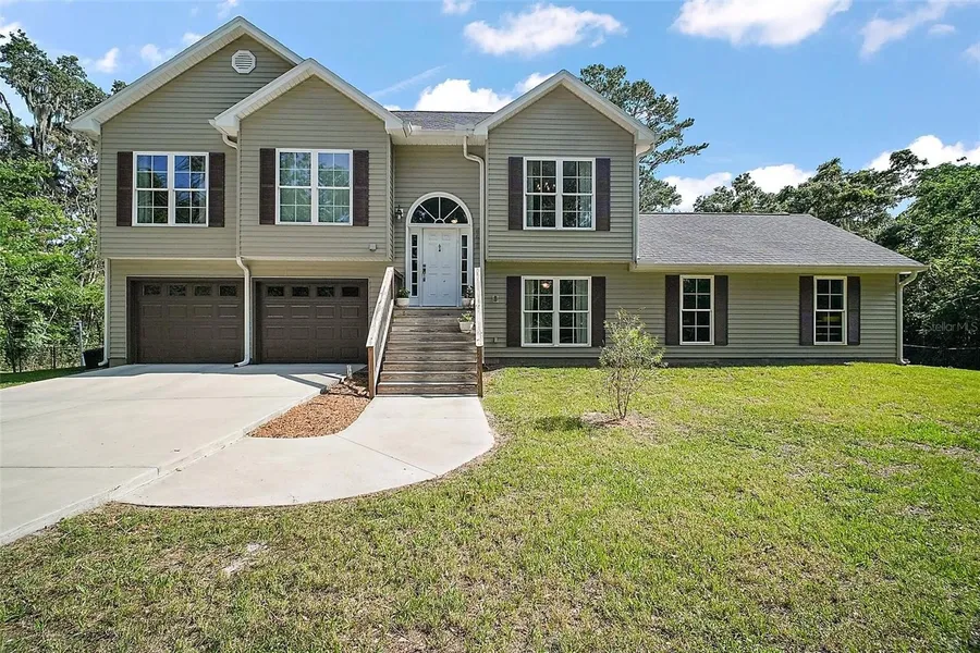 CUSTOM BUILT!! This home boasts 4BR, 3 FULL BATHS, (2) TWO CAR ATTACHED GARAGES and is NESTLED ON 3.9 ACRES IN BELLEVIEW. Enjoy Morning Coffee or your Favorite Beverage on either of the 2 BALCONIES. One is located off the Primary Bedroom and the other is off of the Kitchen. Both have an AMAZING VIEW of your totally FENCED in property, or you can Barbecue on your PATIO just off of the Den. Both Kitchen Deck, and Outdoor Patio are have a Propane Gas Connection for your Grill, no more refilling those propane tanks, since there is a 300 lb. propane tank buried on the property. Home also has a WATER FILTRATION SYSTEM and has a Connection for a PORTABLE GENERATOR. DUAL AC, One for Upstairs and One for Downstairs. VAULTED CEILING in Living Room. 9Ft ceilings upstairs and 8Ft ceilings downstairs. Kitchen has 42inch Cabinets with a CLOSET PANTRY, GRANITE COUNTERTOPS and STAINLESS-STEEL A...
