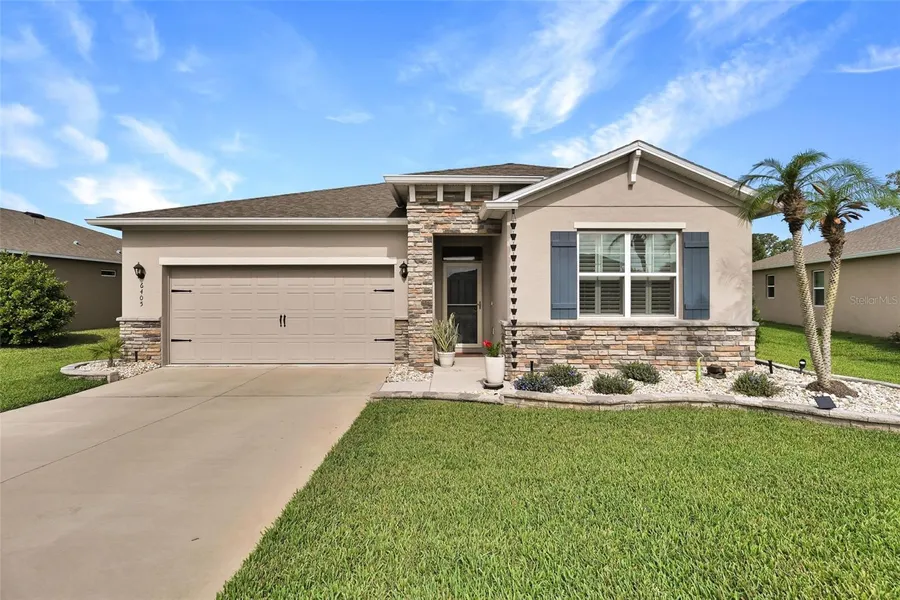 Welcome to this beautiful Clifton model home with 1,811 sq. ft. of living space! The third bedroom is currently used as a flexible office/flex space. Built in 2021, this residence is located in the 55+ gated community of JB Ranch. This smart home is constructed with concrete block and includes 9-foot ceilings, hurricane-grade windows, and updates such as a storm door, plantation shutters, and high-end light fixtures and ceiling fans with dimmer switches. The open-concept layout boasts a large granite island that provides ample seating, meal prep space, casual dining areas, and room for socializing. Additional features include a spacious pantry and a beautifully tiled backsplash that complements the granite countertops and attractive cabinetry. The expansive gathering room flows seamlessly through the sliding glass doors onto the covered screened patio, which is equipped with quality sun ...