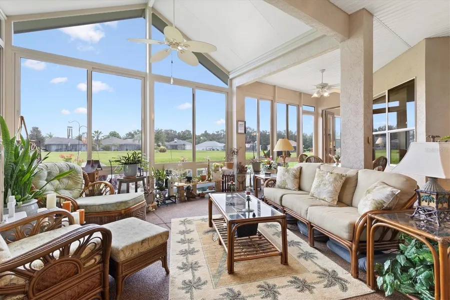 STONECREST 55+GATED GOLF COURSE COMMUNITY WITH ALL THE AMMENITIES AND 4 POOLS. THIS STUNNING CUSTOMIZED SAN MARCO MODEL IS LOCATED ON THE 3RD HOLE OF THE CHAMPIONSHIP GOLF COURSE! AS YOU ENTER THE FRONT DOOR YOU HAVE A GREAT VIEW TO THE GOLF COURSE & ARE GREETED WITH THE FORMAL DINING AREA, FORMAL SITTING AREA AND 12’ CEILINGS WITH CROWN MOLDING. THE REST OF THE HOME GRADUATES TO 10 FT CEILINGS. YOU CAN ENTER THE LANAI THROUGH THE FRENCH DOORS FROM THE FORMAL SITTING ROOM. THE FLORIDA ROOM IS ENCLOSED WITH GLASS WINDOWS & A MITSUBISHI MINI SPLIT PROVIDING AN ADDITIONAL 500 SQ FT OF LIVING SPACE UNDER HEAT & AIR. THE FLOOR IS A STUNNING RIVER ROCK. THERE IS ALSO AN ENTRY FROM THE FAMILY ROOM MAKING THIS HOME IDEAL FOR ENTERTAINING. THE SPACIOUS KITCHEN ALSO HAS AN EATING AREA, GRANITE COUNTERTOPS WITH ABOVE AND BELOW LIGHTING ON THE 42” CABINETS, KITCHEN ISLAND, STAINLESS-STEEL APPLIANCES AND DUAL PANTRY CLOSETS. THE FLOORING THROUGHOUT THE HOME HAS BEAUTIFUL HIGH GLOSS LAMINATE IN THE LIVING AREAS AND TILE IN ALL OF THE WET AREAS. IT IS PERFECT FOR THOSE SEARCHING FOR A 3 BEDROOM/ 3 BATHROOM HOME. THE MASTER SUITE HAS A SITTING AREA, TWO WALK IN CLOSETS & PLANTATION SHUTTERS. THE MASTER BATHROOM HAS A WALK IN SHOWER AND TWO VANITIES ALONG WITH A GREAT SIZED SOAKING TUB & SEPARATED TOILET CLOSET. ON THE OTHER SIDE OF THE KITCHEN THE 2ND BEDROOM IS SET UP PERFECTLY FOR A MOTHER-IN-LAW OR GUEST QUARTERS’ ARRANGEMENT AS IT HAS ITS OWN FULL BATH. THE THIRD BEDROOM IS BEYOND THE FAMILY ROOM WHERE YOU WILL FIND A MURPHY BED WITH A CRAFT DESK, A BUILT IN CLOSET WITH A FLOOR SAFE & ANOTHER FULL BATH. THE LAUNDRY ROOM IS LOCATED JUST INSIDE THE HOME FROM THE GARAGE WITH AMPLE CABINETS AND A COUNTER SPACE. THE TWO CAR GARAGE AND GOLF CRT GARAGE ARE SPACIOUS AND DEEP (28 X 23.5). THE GARAGE HAS A WHOLE HOUSE WATER FILTRATION SYSTEM, SINK AND STORAGE RACKS AND PULL- DOWN STAIRS FOR EASY ACCESS TO THE ATTIC. CALL TODAY TO SCHEDULE AN APPOINTMENT FOR YOUR FOREVER HOME! ROOF 2023; HVAC 2024; MINI-SPLIT 2023