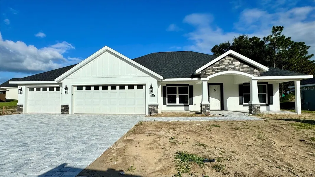 Under Construction. Brand New Construction home available in an award-winning golf course community, Juliette Falls! This is our Rose model: 3 Bedrooms, 2 Full Baths, 3 Car Garage. This plan features an open layout with a large kitchen island and an eat-in kitchen area with french doors to the paver patio. The living room is located right off the kitchen area making this the perfect entertainment home! The master ensuite has a beautiful walk-in shower with floor to ceiling ceramic tile, corner seat, shampoo niche, frameless glass enclosure & a granite vanity with an LED mirror. The spare bedrooms, located on the other side of the house both fit a king size bed and share a full bathroom with a single granite vanity and walk in shower finished the same as the master bath. The garage is a full 3 car finished with epoxy flooring and LED recessed lighting with an oversized paver driveway. This home will be complete with lush landscaping, LED landscape lights & a bluetooth enabled irrigation system. Live in a beautiful gated, top-rated golf course community, located just minutes from Rainbow Springs State Park & the World Equestrian Center! Come see this home today!
