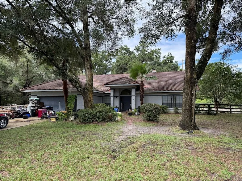 Fixer Upper Opportunity! Welcome to Meadow Wood Farms - a wonderful equestrian community in Ocala just 10 mins to The WEC! This spacious 2.2 acre property is located on a cul-de-sac and features a spacious 2,293 sqft concrete block home with a Spanish tile roof and screened in-ground swimming pool! Inside, the open floor plan is very functional with vaulted ceilings, a floor to ceiling stone fireplace, living, dining and breakfast areas plus 3 BR, 2.5 BA plus an office. The primary suite is spacious with a walk-in closet, an ensuite bath with dual sink vanity, walk-in shower and garden tub. On the opposite side of the home are two additional bedrooms with built-in closets and an adjacent guest bathroom. The indoor laundry room leads to the attached two car garage while sliders in the back of the home lead to the pool. There is also a half pool bath accessed from the pool deck! The back of the property is fenced for your animals. New HVAC 2024. You don't want to miss this opportunity to make this property your own.
