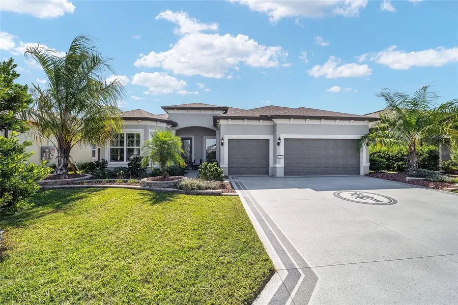 PRICE IMPROVEMENT! WHY WAIT TO BUILD? SELLER IS MOTIVATED AND WILL ENTERTAIN ALL OFFERS! THE SELLER IS OFFERING TO PAY UP TO $10,000 OF A BUYER'S CLOSING COSTS, MAKING THIS AN EXCEPTIONAL VALUE IN TODAY'S MARKET. This stunning 2021 Stellar floor plan on the golf course offers 3 bedrooms, 3 baths, a 2-car garage plus golf cart garage, and 2,512 sq. ft. of beautifully designed living space overlooking the #7 green -- one of the community's most scenic settings. Step inside to an open, split-bedroom floor plan filled with natural light and designer touches throughout. The chef’s kitchen features granite countertops, 42” upper cabinets, soft-close cabinetry with double roll out trays, refrigerator, wall oven and microwave, cooktop, upgraded lighting, stainless steel appliances, and under-cabinet lighting—a true centerpiece for entertaining. Enjoy upgraded engineered hardwood floors, 5-1/4” baseboards, 8’ Cheyenne doors, and porcelain tile in baths, all cabinets and draws in bathrooms and laundry room are soft-close. Crown molding in family room, office/den, kitchen, entry, master bedroom and master bath. The primary suite and guest rooms feature ceiling fans with lights, while the den provides flexible space for a home office or reading retreat. The inside laundry room is equipped with a laundry tub and counter for folding. Additional highlights include an epoxied garage floor, hybrid hot water heater, and Safety Zone water system (whole house) for added efficiency and peace of mind. Relax outdoors on the 42' x 14' extended screened lanai featuring a river rock floor and serene golf course view—a perfect setting for your morning coffee or evening gatherings. Included with the home: gas grill with utensils, cover, and propane tank; all potted plants on the lanai; two storage bins on lanai; two 100’ outdoor hoses with nozzles; two chairs with cushions and table on the front porch; Sony 85” TV (living room) and Sony 52” TV (primary suite) with remotes; and refrigerator in garage. Experience the resort-style lifestyle of Del Webb’s Stone Creek, featuring championship golf, 2 clubhouses, pools, fitness center, walking trails, and a vibrant calendar of clubs and activities. Conveniently located close to shopping, restaurants, and medical facilities.