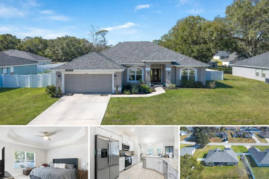 No need to worry about replacing a roof, the HVAC or installing new vinyl fencing that surrounds the back yard. This immaculate 2023 block and stucco home features a 4/2 split floor plan with spacious bedrooms. The primary bedroom is accented with a tray ceiling for a touch of style, dual closets and vanities and access to the covered lanai offering a perfect retreat to spend time with friends or fur babies. The kitchen is upgraded with SS appliances and a water filtration system. A handy breakfast bar makes it easy to grab a quick bite to eat. Formal dining room, huge family and living room means plenty of space to move around especially when family or friends come calling. Close to ST RD 200 where all the action is in Ocala including shops, restaurants, churches and only a 30-mile drive to Crystal River where it's a great place to launch a boat, fish or go swimming. Another grea...