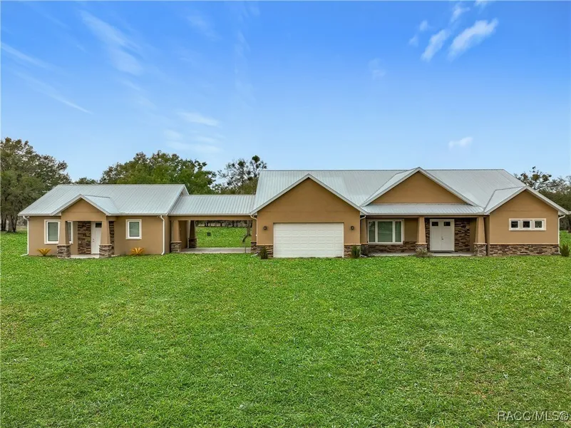 Spectacular opportunity awaits! This custom-built home, completed in 2020, features a separate apartment/in-law suite & sits on a fully fenced 10-acre lot with electric gated entrance. With two distinct residences & a massive 30X65 commercial-grade workshop, this property is just minutes from the world-renowned World Equestrian Center. Whether you're seeking space, income potential, or a prime location, this farm is an ideal choice. Located on a paved road with no HOA restrictions. Short Drive to both HITS and the World Equestrian Center, and moments from the natural beauty of Rainbow Springs. Professionally designed for efficiency, this unique property offers several income-generating possibilities. Live in one home and rent out the other (Airbnb/VRBO) for excellent returns or consider adding an RV hookup to welcome guests. The main residence features 3 bedrooms +office. This home impresses with a grand entrance featuring stone accent columns with a cozy front porch. Step inside to a stunning living room with coffered 10' ceilings, expansive built-in electric fireplace surrounded by tile with tile backsplash wall and sliding doors leading to the back lanai. 30x30 porcelain flooring and 8' doors add a touch of luxury, while the chef's kitchen boasts a Wolf induction cooktop, double oven, Bosch dishwasher, a separate coffee bar area, lots of soft-closed cabinets, and expansive granite counters with a gorgeous waterfall edge island. The private master retreat includes dual walk-in closets and a luxurious bathroom with an all-glass walk-in tile shower. Spacious second and third bedrooms share a well-appointed bathroom. A breezeway connects the main home with travertine tile to the in-law quarters, where you will find travertine tile throughout the home. This home offers two bedrooms, two full bathrooms, a comfortable living room, and a complete kitchen with soft-closed cabinets, granite counters, and is designed for ADA accessibility-perfect for multi-generational living or rental income. The commercial-grade workshop is built on solid concrete, is insulated and offers (2)14' roll up doors. This shop comes equipped with a 3-ton lift extended the length of the shop, an Atlas 7 1/2 horsepower screw compressor with dryer, twin double amp panels, 100-amp breaker disconnect, and is wired for 3 phase, providing ample space for hobbies, storage, or a small business. The property is nestled in a quiet, equestrian-friendly neighborhood that's ideal for riding both on and off the premises. Outdoor enthusiasts will appreciate proximity to Goethe State Forest for horseback riding, hiking, and wildlife viewing, as well as the nearby Rainbow Springs State Park for kayaking & swimming. This spacious country retreat is packed with modern amenities and unmatched outdoor access. It's conveniently located near Dunnellon, Ocala, Gainesville, Bronson, and Cedar Key, with easy access to HITS, WEC, and Blk Prong Equestrian Village for horse events, entertainment, restaurants, and additional amenities.