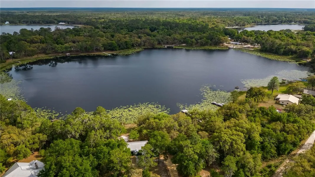 Breezy waterfront living never provided so much potential! Overlooking the sparkling spring-fed Miles Kale Lake in the quiet area of Fort McCoy, this property offers a total of three parcels that each feature roughly 100 ft. of shoreline and a combined 1.91 acres. All of the acreage is fenced, and 2 residences rest on two of the parcels, with the third lot being left in a more natural state as a lovely heavily wooded area. Move-in ready, both homes have been lovingly maintained and are move-in ready with full furnishing. Used currently as VRBO, there is ample potential to continue this usage without much fuss or to instead use this as a personal vacation compound or as year-round residence with a designated guest, in-law, or rental home. On the northern lot is the home named The Big Green House– offering a total of 2-bedrooms and 2-baths, the home was meticulously rebuilt and expanded with all new plumbing, electrical wiring, trusses, a standing seam metal roof, and is highly energy efficient. The interiors feature ample natural light, tall vaulted ceilings, beautiful tongue-and-groove wood work throughout, and lots of space to enjoy. The home features a large great room, as well as a large open kitchen that includes stainless steel appliances, abundant counter and cabinet space, center island with breakfast bar, and adjacent dining nook. Both bathrooms are immaculate, with recent updates and a clean aesthetic. A large screen-enclosed porch rests to the back of the home, providing a wonderful space to enjoy stunning views of the lake and a cozy area to catch some shade. The secondary residence, called The Brown Cottage, rests on the center-most lot. Offering 1-bedroom and 1-bath, this charming cottage features a large family room, a delightful kitchen with adjacent dining area, and a great screen-enclosed porch that overlooks the lake. This home shares the rustic aesthetic of the green home, with lots of tasteful wood-work done throughout the home. A laundry shed is also attached to the home for added ease. Both residences share a well and pump, however, an additional well and pump could be added by the future buyer if desired. A private boat ramp with a recently updated dock allows for easy enjoyment of the lake, opening up a variety of uses for those who enjoy spending time on their boat. Mile Kale Lake is a wonderful, natural Florida lake with a nice sand bottom and a few unique features that make it extra exciting– the lake has a gradual slope and is deeper than many other lakes in the area. The lake is great for boating on canoes, kayaks, jet skis, or even power boats with other boats rarely being seen on the lake to provide little to no disruption on most days. Many other lakes are also in the area, making this an ideal property for those looking to discover the many options Central Florida has to offer! If you’re ready to take in pristine water-front views or are looking for an income producing opportunity, this property is a wonderful option to consider!