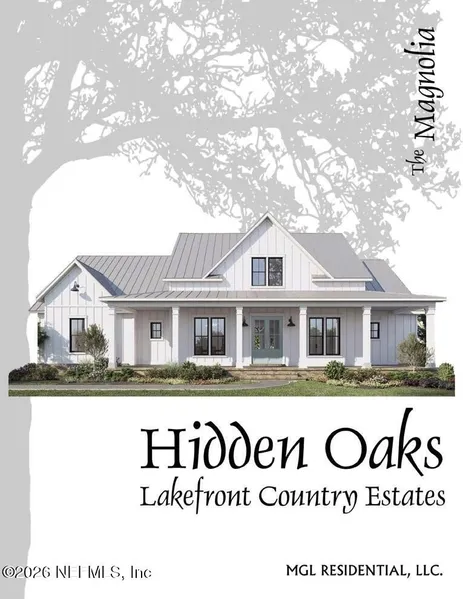 Welcome to this top-quality Custom Designed LEED/Energy Star Rated MAGNOLIA floor plan located in Hidden Oaks Lakefront Country Estates. Walking up to the home you are greeted by a 49' x 8' wrap around porch. This home is a single-story masterpiece with 2,720 sq ft of living space consisting of 3-4 bedrooms and 3 baths with optional 2nd floor bonus room, a residence that blends modern comfort with thoughtful design. 4th bedroom can be used as a home office. The Great room offers graceful gathering and entertaining space, gorgeous gas fireplace that is across from a spacious gourmet kitchen with large quartz countered island, breakfast nook, oversized pantry, and formal dining room. The home offers a side entry 3 car garage with mud room and ample laundry room. The private owner's suite si incredible. A Designer closet with peninsula island, large soaking tub, double vanities, and custom shower add another level elegance and sophistication to this already gorgeous home. There is a large covered rear porch with outdoor grilling area and wood burning fireplace for those quiet evenings watching nature at si best along Lake Nicatoon. MGL Residential, LLC. offers 6 Custom Homes with additional models available upon request. Choose from 6 beautiful Lakefront lots and choose one of our Custom-Built Homes. Each model can be designed to fit your needs. Structural options and upgrades are available on all floor plans: Gourmet Kitchen, knee wall cabinets at kitchen island, Tray Ceilings, Crown Molding, study/bedroom, covered and or screened extended Lanai, outdoor kitchen rough in, paver driveway and Lanai, water softener packages, garage utility sink, outdoor lighting and landscaping packages, Elevation Designs, and 3rd car/golf cart garage. MGL Residential, LLC Custom Home Builder offers the opportunity to personalize the entire 3,935 square feet of this home to meet all your needs and dreams. **This rendering is a conceptual drawing only and not meant to represent the actual elevation, roofing material/color or exterior colors. Builder reserves the right to modify. This New Construction Listing corresponds to the vacant lot MLS listing #1197724.