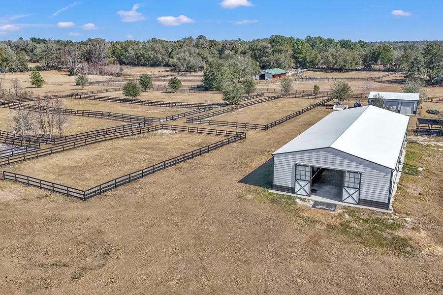 Turnkey 20-acre horse farm in desirable northwest Ocala. Exceptional equestrian property is just a mile from HITS and 12 miles to WEC! This meticulously designed farm features a well-appointed barn with 12 oversized stalls, European fronts, a Comfort Stall mat system and automatic waterers. The airy barn boasts a wide aisle, two grooming stalls, a climate-controlled tack room with custom built-ins, a feed room with built-in storage, and a bath with washer and dryer. Additional amenities include two outdoor wash stalls, a water filtration system, eight paddocks with water to each, a large three-bay equipment garage/hay storage, an irrigated dressage arena and a spacious grass jump field. The property also offers an RV hookup with septic. Plenty of room to hack around the property, all paddocks have lanes between. Being sold turnkey and includes jumps, PVC dressage arena, tractor, zero-tur...
