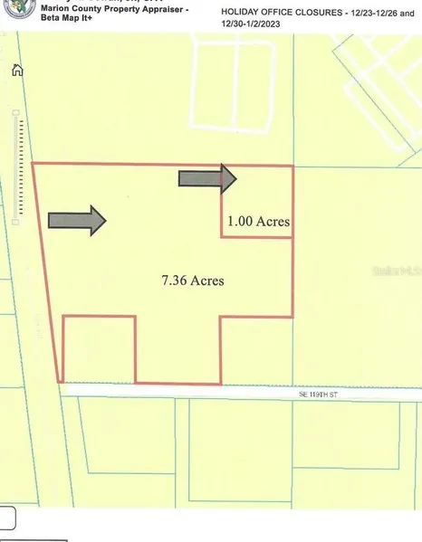 Great Location. This land is two properties being SOLD AS ONE - PARCEL# 38515-000-00 address 6601 SE 119th St. Belleview, FL 34420 (7.36 acres) and PARCEL# 38615-000-00 address 11600 S. US Hwy 441 Belleview, FL 34420 (1.00 acres). TOTAL LAND SIZE is 8.36 acres. This land is B5 Zoning.