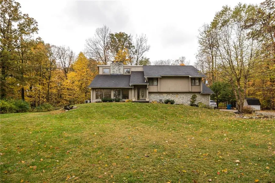 Nature lovers paradise AND a gorgeous home AND a pool AND an outbuilding! Dont forget to check out the amazing two story+ double sided stone fireplace! This home has 3 good size bedrooms and 2 1/2 baths AND large bonus loft. Needs just a little TLC to make it your own. Home features large windows with gorgeous views and a master bedroom balcony to drink your morning coffee on. Short trip to downtown Indy or Fishers. No HOA and lots of privacy. 30x56 outbuilding with concrete floor as well.
