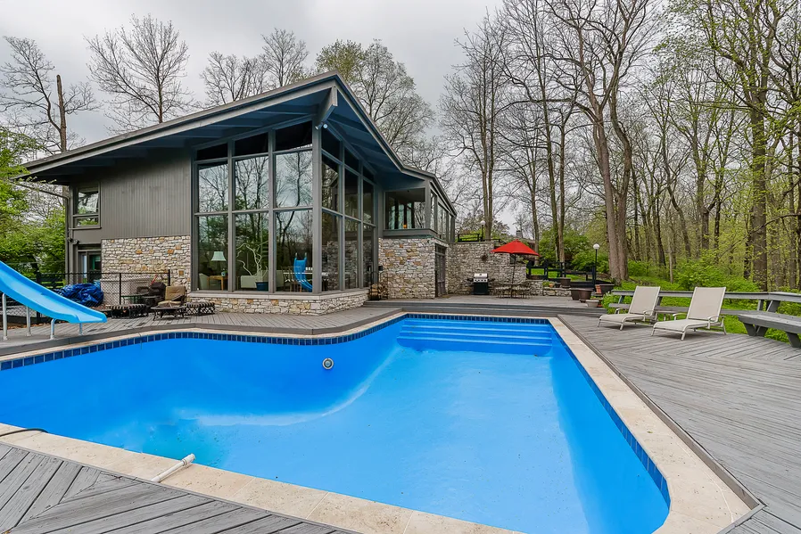 Nestled on top of a hill on over an acre wooded lot sits this classic Post and Beam midcentury home that will take your breath away!!! This genius architectural design brings the outdoors in with drama and style! 3 bedrooms, 4 full baths (each bedroom with its own bath!). New hrdwds! Stunning great room with soaring ceilings and huge stone wall! Be engulfed in nature year round with the incredible views! L shaped concrete pool that was just painted with new tile! Amazing home for for entertaining! Roof 6 years old, new kit appliances. This is a masterpiece!