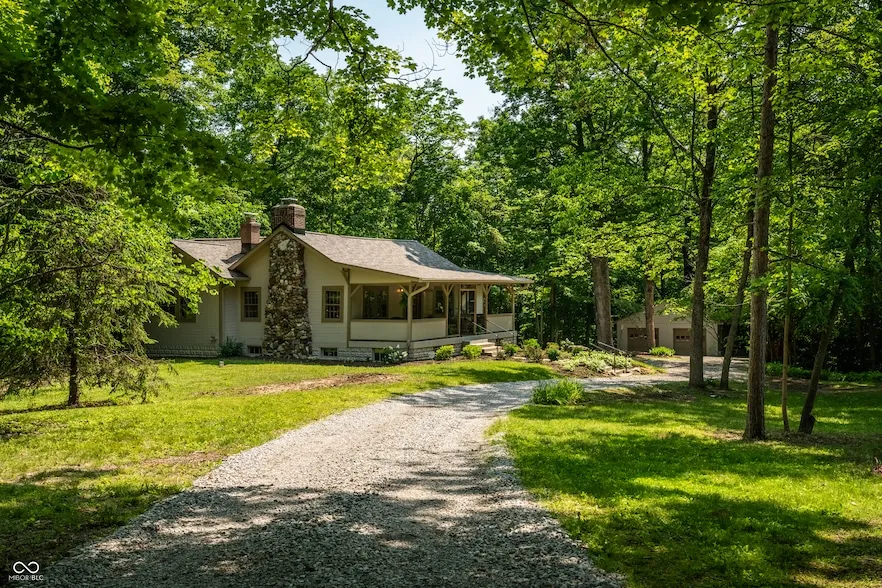 A charming front porch welcomes visitors at the end of a private drive, setting the tone for a true escape. Nestled on over 5 acres of rolling hills, this 1930s cabin blends rustic beauty with modern comfort-an ideal retreat for adventurers, nature lovers, and those in search of open space and quiet. Inside, vaulted ceilings, original hardwoods, rich wood paneling, and a cozy loft define the inviting interior. A striking stone fireplace anchors the living space, perfect for cool evenings after a day outdoors. The 2-bedroom, 2-bath layout has been thoughtfully updated with a new roof, mechanicals, and appliances-offering peace of mind while preserving the cabin's timeless charm. The walk-out basement provides ample space for storage or a workshop, while a detached garage accommodates gear of all kinds-ATVs, kayaks, or extra vehicles. Private trails meander through the property, leading directly to Eagle Creek for fishing, kayaking, or wooded hikes. Just minutes away, Eagle Creek Park-the city's largest-adds even more opportunities for sailing, rowing, and exploration. Nearby, Traders Point Creamery offers farm-to-table dining and seasonal events, adding to the area's distinctive appeal. A place for both adventure and stillness-where fireflies flicker through the trees and every sunset feels like a moment worth remembering.