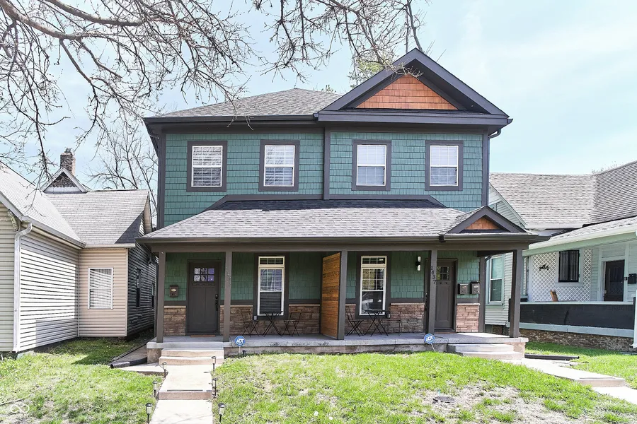 Beautiful FULLY FURNISHED remodeled 2BD/2.5BA duplex with a front porch in the revitalized Bates Hendricks neighborhood. First floor has a living room, kitchen and powder room. Upstairs has Primary bedroom with ensuite, 2nd bedroom, laundry closet and full bath. LVP flooring throughout and fully fenced in yard. If you enjoy being outside, the fully fenced in yard has a covered deck in the back yard off of the kitchen and an upstairs deck off of the primary suite. Close to the interstate, Eli Lilly and downtown Indianapolis.