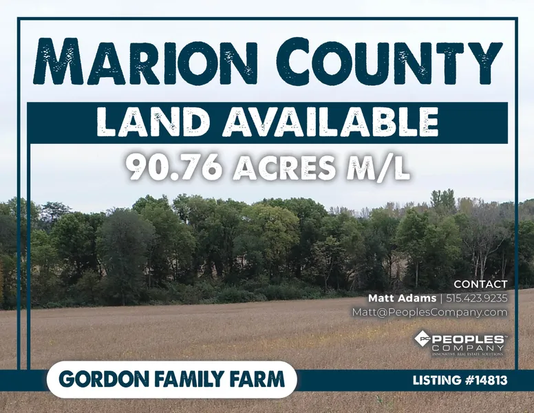 Peoples Company is representing the Gordon family on the sale of their familys farmland in Marion County, Iowa. This farm has been under ownership by the Gordon family for over 100 years! The farmland consists of a total of 90.76 acres m/l and consists of 77.94 FSA tillable acres with a CSR2 rating of 76.3. This would be considered a high quality farm for Marion County when comparing the percent of tillable acres and the county average CSR2 rating of 59.7. Primary soil types including top producing Fayette silt loam, Downs silt loam, and Nodaway-Vesser silt loam.