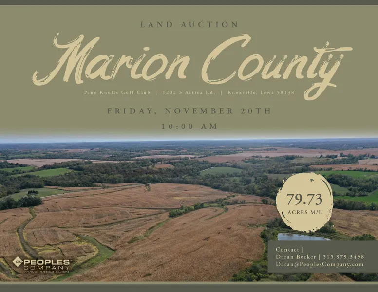 Peoples Company is pleased to offer 79.73 m/l gross acres of farmland located 5 miles Southeast of Knoxville, Iowa. The 68.36 m/l tillable acres carry a CSR2 of 70.3 and features Sharpsburg soils. They have been improved with tile and terraces and are currently planted to corn. If you're looking for a place to build this property sits just a mile off of pavement and has amazing views and includes a timbered draw, a nearly 2 acre stocked pond and has excellent hunting. Possession is subject to tenants rights. The Auction will take place at the Knoxville Country Club on Friday, November, 20th 2020 at 10 am. This would make an excellent add on to an existing operation or perfect for a beginning farmer just starting out.