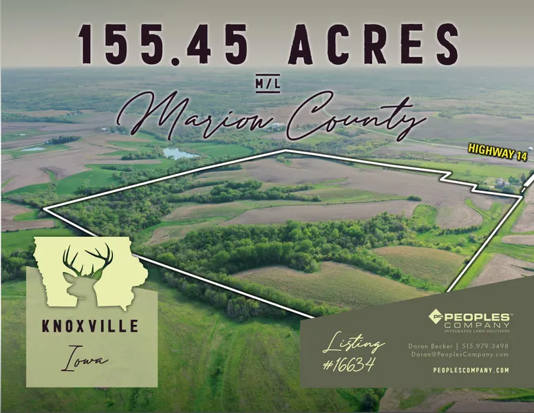 Peoples Company is pleased to present a 155.45-acre combination farm located south of Knoxville, Iowa, in Marion County. This farm is set up to grow and hold whitetail deer with the perfect mix of tillable, CRP, and mature timber. If you don't believe the pictures or the video, just drive down and take a look for yourself. There are 50 acres of cropland with 55.1 CSR2 that are currently being cash rented and an additional 45.98 acres that are in CRP until 2030. The tall grass CRP lies on the south-facing slopes of this farm, creating an ideal bedding area for deer, and as a bonus, it is loaded with pheasants. The remaining 13+ tillable acres form a boundary next to the timber and could be planted into a transition food source area between the CRP and timber. The CRP pays $153.15 per acre for a total payment of $7,042 per year. The cropland is rented for the 2023 cropping season, with det...