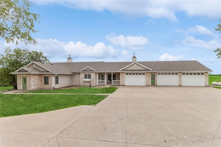Come explore all this 19.56 acres has to offer you! 2904 sq. ft ranch home - 4 bedrooms and master suite- 3 1/2 baths- full finished walk out basement with kitchen - upper & lower family rooms - large dining area and kitchen - loads of storage - 2 laundry rooms - large wrap around deck on back that overlooks the pond. 3 car attached garages extra deep and wide - several extra rooms- walk-in closets - 50 X 72 metal shop building concrete floor and loft area (one stall heated) also Metal shop 50 x 80 concrete floors (one stall heated with office and 1/2 bath) and loft above. Red barn 30 x 38 with concrete floors - several stalls and steps to upper left - 2 different pasture areas with 8ft fencing with gates & 4 hydrants all ready for your hobby farm needs! Dock on the large pond and bridge to island - also smaller pond behind house -ponds are stocked with fish. Ground around is in grass hay. Come see this one and live out your dreams! Just one mile of gravel and minutes to Pella! Owner is licensed real estate agent in IA B33173000.