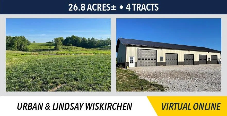 The Urban & Lindsay Wiskirchen real estate will be sold on a price per acre basis, based on the surveyed acres. All 4 tracts will be offered through the marketing method of Buyers Choice, whereas the high bidder can elect any of the tracts for their high bid. If the high bidder does not elect all offered tracts, then the remaining tract(s) will continue to be offered Buyers Choice until all tracts have been elected. The tracts will NOT be offered together or in any combination at the conclusion of the auction.