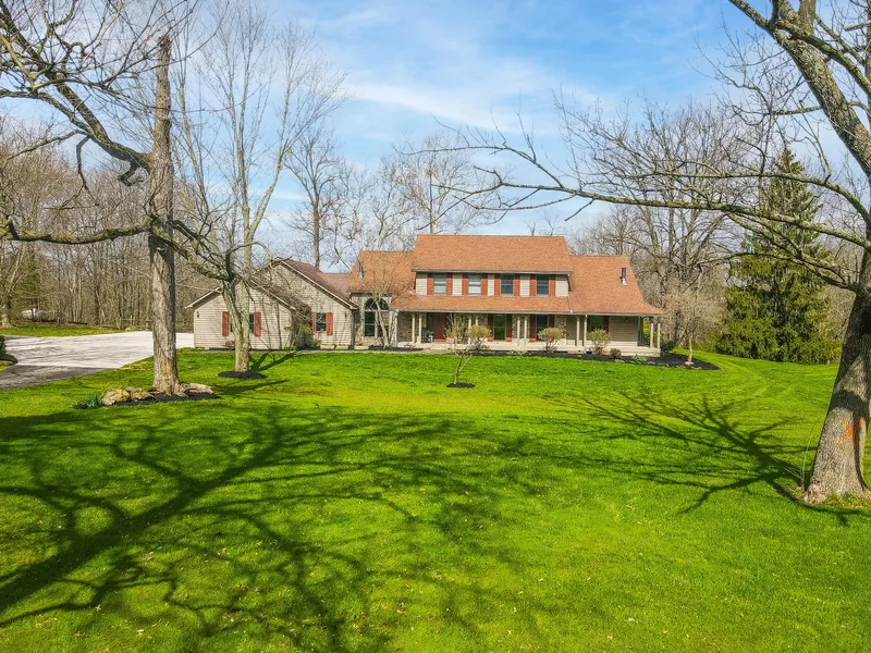 Welcome to captivating sunsets as your scenic backdrop. This 4-5 bedroom home offers an open floor plan, with hickory hardwood floors throughout the main floor, and an updated kitchen with all new appliances. The stairway in the foyer leads to a secluded primary suite, with an additional 3 bedrooms and loft that offers versatility as an office and/or bonus room. The walk out basement is fully refinished just waiting for you to give it purpose, possibly a gym, game room, or additional living space! Beyond the French doors is a magnificent view from a multi-level deck with fire pit and covered porch. Enjoy taking walks to the covered bridge or wading in the creek! This grand home with serene surroundings is breathtaking!Seller is related to listing agent.