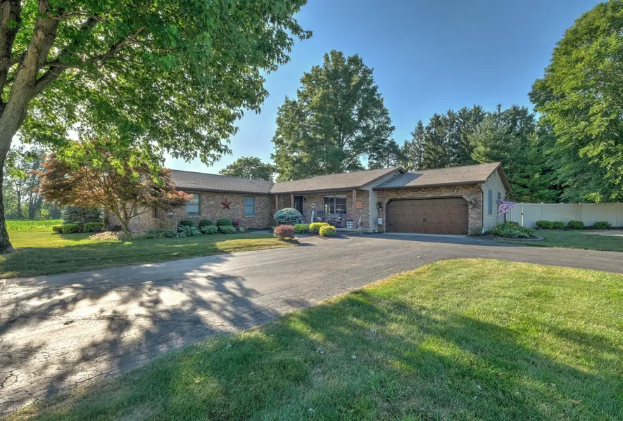 Find paradise w/this 2300+sqft brick ranch on 5 acres w/woods, outbuildings, & pool area. Quality abounds w/french doors, wood floors, & gorgeous crown molding. A primary suite boasting newly remodeled bath w/beautiful walk-in tile shower, main floor laundry, & a cabinet filled kitchen w/ breakfast bar are an added bonus. Maintenance free outdoor living begins on the Trek deck & vinyl railing overlooking the woods, while meandering sidewalks guide you to a freeform inground pool, hot tub, and pool house. Property also boasts 2 barns complete w/electric & concrete floors...one has adorable front porch, office space, and stalls that currently house REINDEER, & the 2nd w/overhead door, hayloft, and more reindeer(or horse) stalls! Updates: 2022- Furnace, A/C, tankless water heater. 2018-roof.