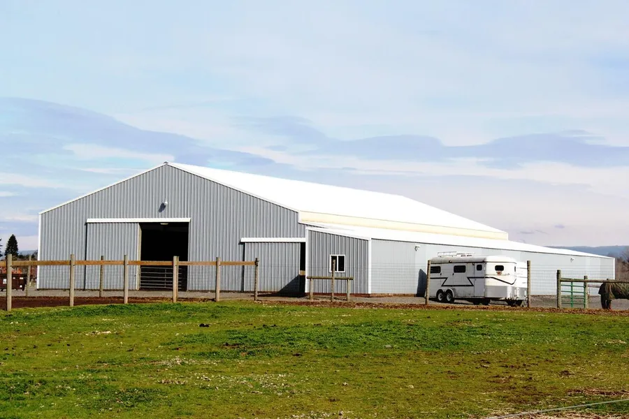 Covered Arena Barn: This working horse ranch business has been established since 2001. The arena building has a 60X120 arena and nine 12X12 stalls, with feed doors and are fully matted with automatic waterers. The insulated tack room is 12X20 and the 12X12 wash rack has both hot and cold water. At the back of the building is a 24X36 hay shed.