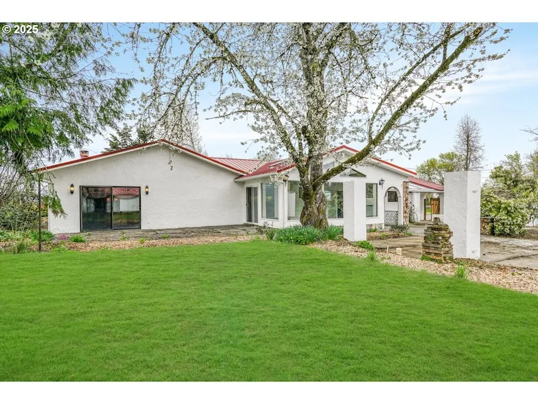 Charming Spanish-Style Retreat on 4.38 Acres of Open Country Living! Step into this beautifully unique home and immediately feel the peace of wide open space. The sunroom welcomes you with wraparound windows, vaulted ceilings with brand-new skylights, and classic brick flooring making it perfect for soaking in panoramic views year-round. The spacious great room features a cozy pellet stove and sliders leading to the backyard, while the kitchen is a true country delight with vaulted, beamed ceilings, all new stainless steel appliances, tile countertops, and a pantry. The dining area offers warmth with rich hardwood floors. Retreat to the generous primary suite, complete with a wood-burning fireplace, walk-in closet, and private bath with double sinks and a relaxing soaking tub. Three additional bedrooms, a full bathroom with tub/shower, and a dedicated office with new skylight that could also be a 5th bedroom, offer room for everyone. Functional and spacious mud room/laundry room with storage cabinets and porch access completes the interior. Outside, the property shines with a large workshop that includes an automotive paint booth, two horse stalls, a tack stall, and additional storage. Plenty of space to roam, relax, or build your dream hobby farm. Water rights administered by Santiam Water Control District. Enjoy peaceful country living just minutes from dining, Santiam Golf Course, Turner Lake for swimming, fishing, and picnicking, plus walking paths for outdoor enjoyment. This one-of-a-kind property blends rustic charm with everyday comfort, come see it today!