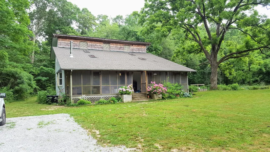 Beautiful and private setting down a long driveway on a level lot. Plenty of room for gardening in the large yard that surrounds the rustic mountain style home. Home features separate dining room with build in shelves, ground level master bedroom and bath with two large bedrooms and bath on the upper level. Living room and dining room features tall ceilings. Wood stove in living room functions as backup heat source. Detached workshop that doubles as a 3 bay garage providing room for garden equip
