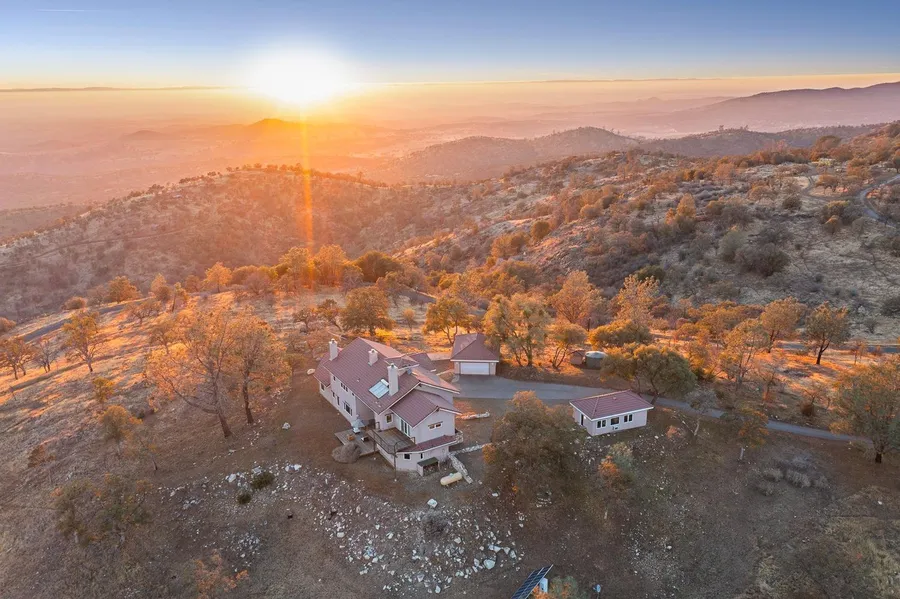 A well-kept secret by design, Woolf Ranch Estate offers quiet rural living on 161 acres atop the exclusive Guadalupe Ridge in Mariposa County. Exquisite living at 2,650 foot elevation with unmatched 360 degree views; a fulfilled vision and a legacy of original Beverly Hills architect/designer sole owners who created a sophisticated place to reside and run their corporation. Their inspiration was prescient; blending beauty, technology, ease of maintenance and self-sufficiency long before sustainable became a household word. The 4,800 square foot interior is ideal for large parties, private dinners or solitude; a temple of pristine spaces, affording clean natural and art lighting by design day or night. The uninhibited dome of sky and breathtaking land views, visible from every room change with each hour of the day and season. The elegance of the clean lines and high ceilings are unpretentiously naturalized by the gorgeous use of different woods (teak, alder, pine, oak, maple, redwood, mahogany, and walnut) throughout. Natural stone fireplaces grace the dining room, library/media room, primary bedroom suite, and the spacious living room, using rock harvested from the property.