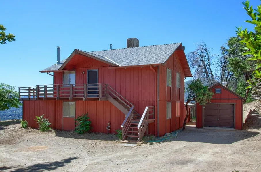 Welcome to this rustic and charming 3 bedroom, 2 bath home with stunning views! Set on a beautiful 2.8+/- acres, the multiple decks take advantage of the breathtaking mountain views and are wonderfully large making it a great place to entertain with built-in benches! The living room offers a sliding door to the deck and continuing on to where you will find the dining room with a freestanding wood stove, a cute country kitchen leads you to a spacious sun room. The lovely tongue and groove beamed ceilings are through the home. Enjoy the decks that leads to a neat separate bonus room building that is great for a craft room, art studio, home office or whatever you dream up. Also has a 1 car detached garage. Your home is waiting for you in the Lush Meadows area which offers privacy and a great location between Oakhurst and Mariposa. Adventure is all around you! Yosemite National Park, several lakes, historic locations, golf courses, hiking, camping, winery tours and more!