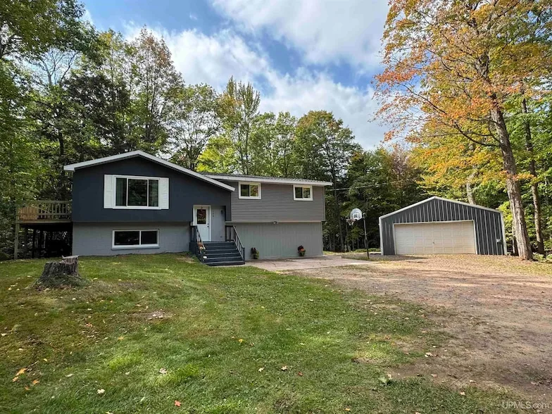 Home is back on market due to financing. This stunningly updated bi-level home, just 15 minutes from downtown Marquette, where modern comfort meets serene natural beauty. The open-concept layout bathes the interior in natural light, offering breathtaking views of the surrounding woods. Step onto the spacious deck to relax and soak in the tranquility of peaceful evenings. This home features 4 generously sized bedrooms, including a luxurious primary suite with an en suite bathroom and a charming decorative fireplace. Recent upgrades ensure a move-in-ready experience, including modern flooring, remodeled bathrooms, and a fully updated kitchen with new appliances and cabinets (2024). Additional improvements include brand-new windows (lifetime transferrable warranty) throughout (2025), a new furnace and water heater (2024), a freshly installed roof (2023), and a new well tank (2025). The freshly repainted exterior enhances the home s contemporary curb appeal. The property also boasts a pole barn-style garage with a durable metal roof and a 50-amp subpanel, perfect for your storage or workshop needs. This home is a perfect blend of modern updates and natural charm ready for you to make it your own! Home Warranty included by sellers. .