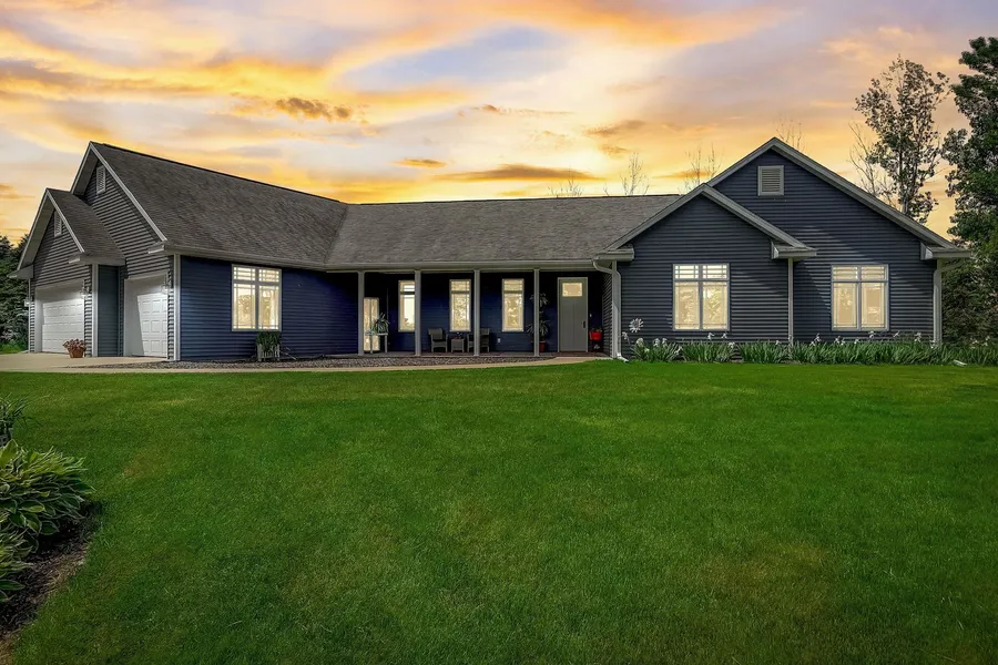 Parade home floor plan designed for easy accessible living. Zero step at front & garage entry. Enjoy the sunrise over the pond from front porch. Elegant foyer open to formal dining. Grand kitchen w/custom Alder cabinetry, lg island & pantry. Floor to ceiling WB FP double sided design to enjoy from living rm & sun rm. Sun rm offers walkout to patio for a sunset bonfire. Primary suite w/lg walk-in closet, soaking tub & tiled shower. Open feel thru-out w/vaulted & 9' ceilings. Geothermal radiant heat offers warm floors. Storm shelter. Extra garage w/ storage rm & dog access to yard. 115+ acres to enjoy trails, forest, prairie, some wetlands, & 37 tillable acres that is rented. Excellent hunting & plenty to do nearby: John Muir Cty Park, WI Dells & Cascade. Home & 35 acres $999,900 see mls